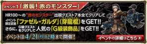 HR100からの「赤のモンスター」出現クエストが7本出現!全てクリアするとイベント限定武器として「ファゼル・ガルダ」(穿龍棍)をGET!
