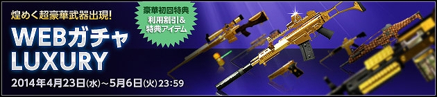 豪華カモフラージュが施された特別武器が当たる「WEB ガチャ LUXURY」を期間限定で実施!出現レアアイテムが異なるものを、8 つご用意しておりますので、是非お目当ての武器を狙ってみてください!