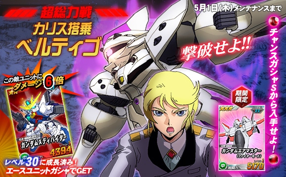 「カリス搭乗ベルティゴ」を倒した際に引くことができるチャンスガシャSには、「★3ガンダムエアマスター(ファイターモード)」「★3グフ」、「★3アルヴァアロン」、「★3アストレイブルーフレームフルウェポン」を獲得するチャンスがあります。また、「カリス搭乗ベルティゴ」に対し6倍の攻撃力を発揮する「★2ガンダムXディバイダー」がエースユニットガシャに登場いたします。