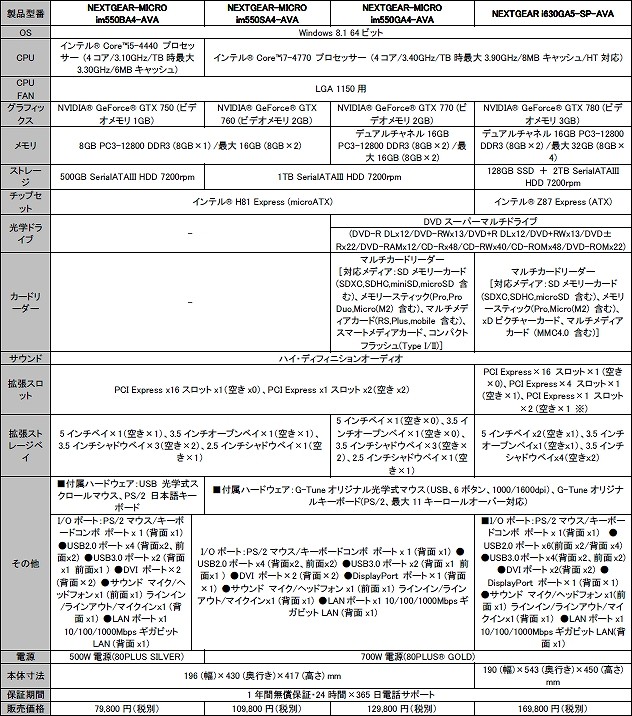 快適なゲーム配信も楽しめて、クラン戦も戦えるハイスペックモデルとして、「NEXTGEAR-MICROシリーズ」より、インテル Core i7-4770プロセッサー、デュアルチャネル16GBメモリ、1TBハードディスク(7200rpm)、NVIDIA GeForceGTX770、DVDスーパーマルチドライブ、80PLUS GOLD認定取得700W電源、Windows 8.1をプリインストールした「NEXTGEAR-MICRO im550GA4-AVA」を12万9,800円(税別)でリリースいたします。