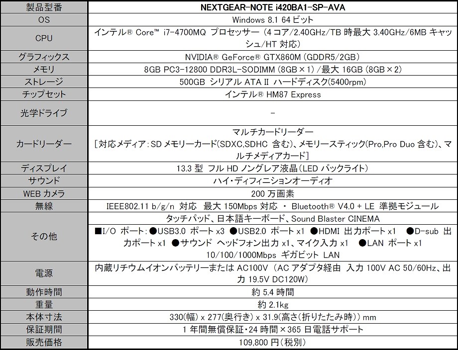 外出先でも「AVA」を体感できる、エントリーモデルの13.3型モバイルゲーミングノートパソコンとして、インテル Core i7-4700MQプロセッサー、8GBメモリ、500GBハードディスク(5400rpm)、NVIDIA GeForceGTX860M、Windows 8.1をプリインストールした「NEXTGEAR-NOTE i420BA1-SP-AVA」を10万9,800円でリリースいたします。