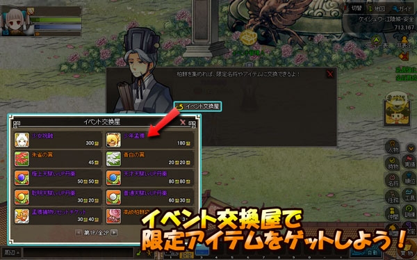 ケイシュウ-江陵城(716,166)にいるNPC「イベント管理人」の交換屋において、集めた柏餅を子供の日限定アイテムと交換することができます。柏餅は「名将クエスト」や「四神ガチャ」、「妖怪との戦闘」などで獲得できます。