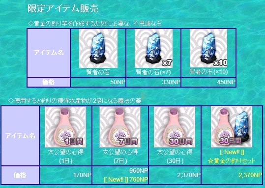 イベント期間中のみ、「賢者の石」「太公望の心得」を販売いたします。一部アイテム価格の割引実施と、新規セットアイテム「黄金の釣りセット」の販売を行います!詳しくは、公式サイトイベント情報をご確認ください。