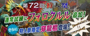 第72回の狩人祭では、華鳳鳥「フォロクルル」が通常試練に追加。さらに、狩人祭限定の穿龍棍「ヴォーラファレッド」とHR3から生産できる炎属性武器「ルレードシリーズ」が新たに登場となっておりますので、ぜひご参加ください!