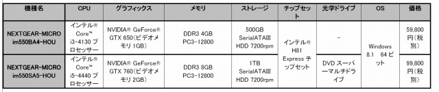 抜群のコストパフォーマンスを誇る「NEXTGEAR-MICRO シリーズ」より、インテルCore i3-4130 プロセッサー、4GBメモリ、500GBハードディスク(7200rpm)、NVIDIA GeForce GTX650、インテル H81 Express チップセット採用microATX マザーボード、80PLUS SILVER 認定取得500W電源、Windows8.1をプリインストールした「NEXTGEAR-MICRO im550BA4-HOU」が5万9,800円(税別)。