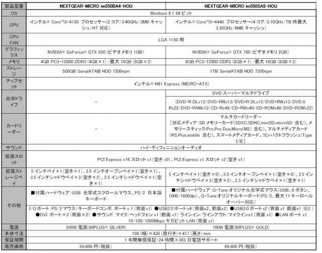 「NEXTGEAR-MICROim550BA4-HOU」をベースにインテルCore i5-4440 プロセッサー、8GBメモリ、1TBハードディスク(7200rpm)、NVIDIA GeForce GTX760、DVDスーパーマルチドライブ、80PLUS GOLD認定取得700W電源を搭載した「NEXTGEAR-MICRO im550SA5-HOU」が9万9,800円(税別)となります。