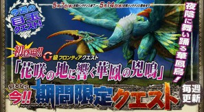 カプコンは、「モンスターハンター フロンティアG」において、5月9日より「はじめよう!ギルド優先依頼G!」を実施、また、本日5月7日より「期間限定クエスト」にて夜の花畑にG級フォロクルルが登場するクエストを初配信する。