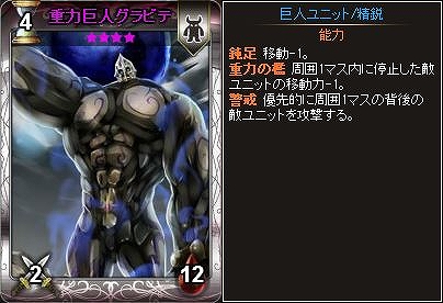2014年5月7日(水)17:00から、イベントカード「重力巨人グラビテ」を入手できるキャンペーンを実施いたします。「重力巨人グラビテ」は周囲1マス内に停止した敵ユニットの移動力を-1にする「重力の檻」の他、「警戒」「鈍足」の能力を持ちます。入手方法は「イベントクエストをクリアしてGET!」と「プレミアムカードとしてGET!」の2種類があります。