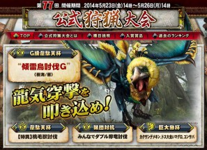 カプコンは、「モンスターハンター フロンティアG」において、5月23日よりゲーム内イベント「第 77回公式狩猟大会」を実施する。