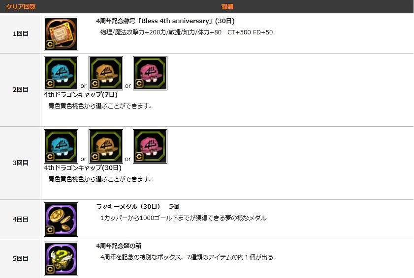 皆様のご愛顧によりドラゴンネストは 4 周年を迎えることができました。誠にありがとうございます。皆様に感謝の気持ちを込めて、4 周年記念イベントを開催いたします。いつもプレイされているお客様、これから始めるお客様や久しぶりにプレイされるお客様に合わせたイベントをご用意いたしました。ぜひご参加ください。今後ともドラゴンネストを宜しくお願いいたします。