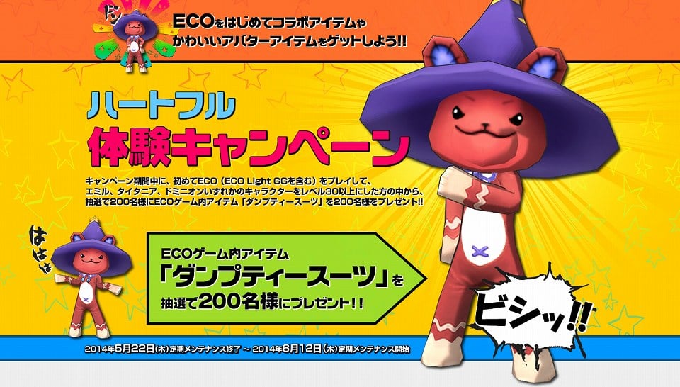 キャンペーン期間中に、初めてECO(ECO Light GGを含む)をプレイして、エミル、タイタニア、ドミニオンいずれかのキャラクターをLV30以上にした方の中から、抽選で200名様に、ゲーム内アイテム「ダンプティースーツ」をプレゼント!!