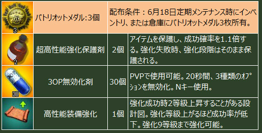 また、兄貴ボックスからは一定の確率で「パトリオットメダル」を獲得することができます。「パトリオットメダル」をイベントレイド終了1週間後の6月18日(水)定期メンテナンス開始前までに、3枚集めてアイテムインベントリに所持、または倉庫に保管していると、超高性能強化保護剤2個、3OP無効化剤30個、高性能装備強化設計図1枚を報酬として、パイロットにプレゼントいたします!