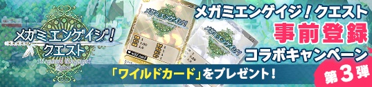 近日リリース予定のスマートフォンアプリ「メガミエンゲイジ!クエスト」の事前登録完了後にプレイできる「フライング・バトル」で規定数勝利すると「メガミエンゲイジ!」でつかえる「ワイルドカード」のシリアルコードをプレゼント!