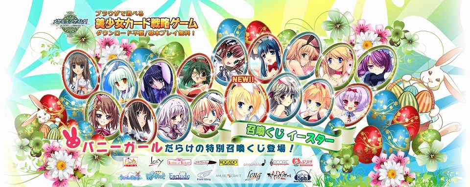 イースターにちなんで、有名美少女ゲーム16ブランドから選りすぐり「バニーガール」だけを特別招集!うさ耳少女だけしか出ない、特別な召喚くじです。
