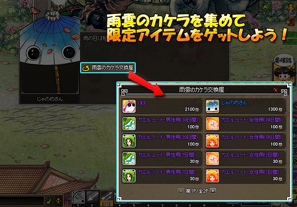 ケイシュウ-江陵城(714,164)にいるNPC「じゃのめさん」の交換屋において、集めた雨雲のカケラをキャンペーン限定アイテムと交換することができま