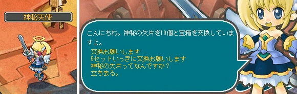 聖光城、永夜宮、風香林、鉄機塞、シュロ基地にNPC「神秘天使」とNPC「解錠マスター」が配置されます。モンスターや採集資源から「神秘の欠片」を10個集めてNPC「神秘天使」に持っていくと、アイテム「宝箱」・「鍵のかかった宝箱」のセットと交換することができます。