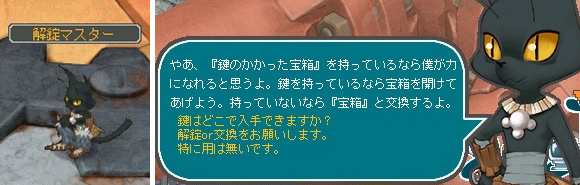 「鍵のかかった宝箱」は、解錠にエンジェルモールで販売されている「不思議な鍵」が必要です。NPC「解錠マスター」へ、「鍵のかかった宝箱」と「不思議な鍵」をセットで持っていくことにより、「鍵の開いた宝箱」へと交換が行えます。なお、「鍵のかかった宝箱」は、「宝箱」と交換してもらうことも可能です。
