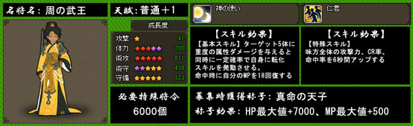 新しく登場した封神名将「周の武王」は、最高ランクの名将である「神秘名将」に匹敵する高い能力値と、味方全員の攻撃力・命中率・クリティカル発生率を増加させる補助スキルを有する、オールマイティな名将となります。