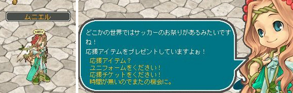 NPC「ムニエル」がエンジェル学園に配置されます。NPC「ムニエル」からは、キャラクターの性別に応じて「サッカーユニフォーム(青)(男)」や「サッカーユニフォーム(青)(女)」が受け取れ、更に「応援チケット」が配布されます。