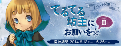 エデン大陸にもうすぐ梅雨がおとずれます。今年の梅雨も晴れの日が多くなるように、はりきって大量のてるてる坊主を用意していたNPC「水無ずきん」ちゃんですが、何やら問題が発生しているようです。なんと、今年もモンスター達がたくさんやってきて「てるてる坊主」をすべて持ち去ってしまったらしいのです!