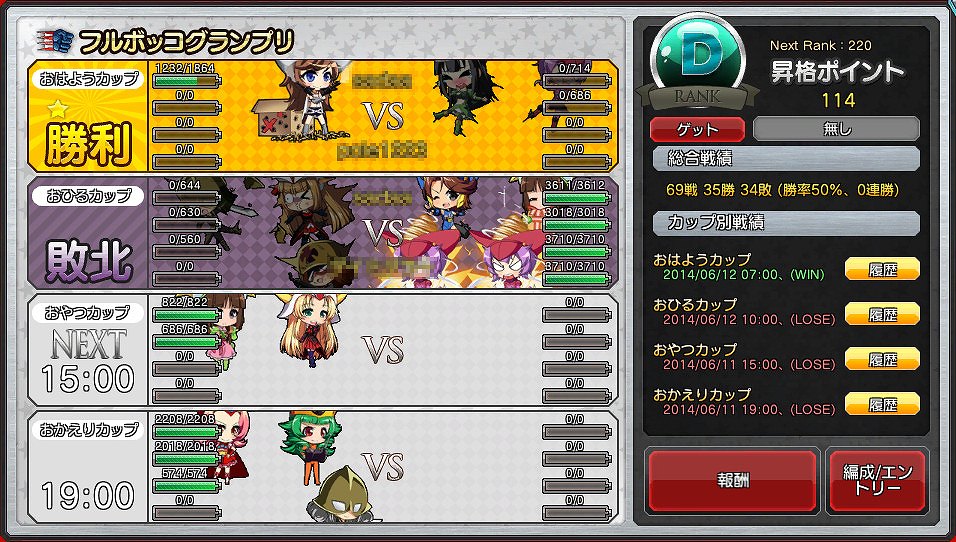 「ボコグラ」は1日4回開催され、出場させるユニットを編成し事前に登録しておけば、開催時間になるとランダムで対戦相手が決まり、勝利する毎に昇格ポイントが増えていきます。昇格ポイントを一定値獲得するとランクアップして豪華報酬をゲット!