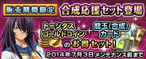 期間限定で、「合成応援セット」を販売開始!トーシダスゴールドコインと龍玉(合成)カードがセットになった超お得なセットです!「合成応援セット」で闘士を強化しよう