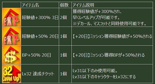 イベント期間中、新規登録をしていただくと、一気にレベル32になることができる「Lv32 達成チケット」とレベルアップに役立つアイテム「経験値+50% 20日」、「BP+50% 20日」、「経験値+300% 3日」をプレゼントいたします!