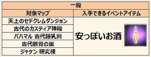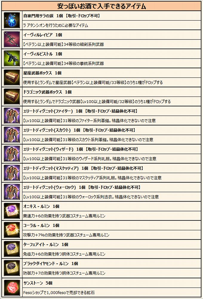 それぞれのお酒を10個渡すと、「サラの涙」等のレアアイテムや武器防具装備、ゲーム内通貨Fesoに交換できるアイテム等、すぐに使えるアイテムがランダムで入手できる?!期間中、何度でも交換できますので、どんどん集めて報告をしてください!