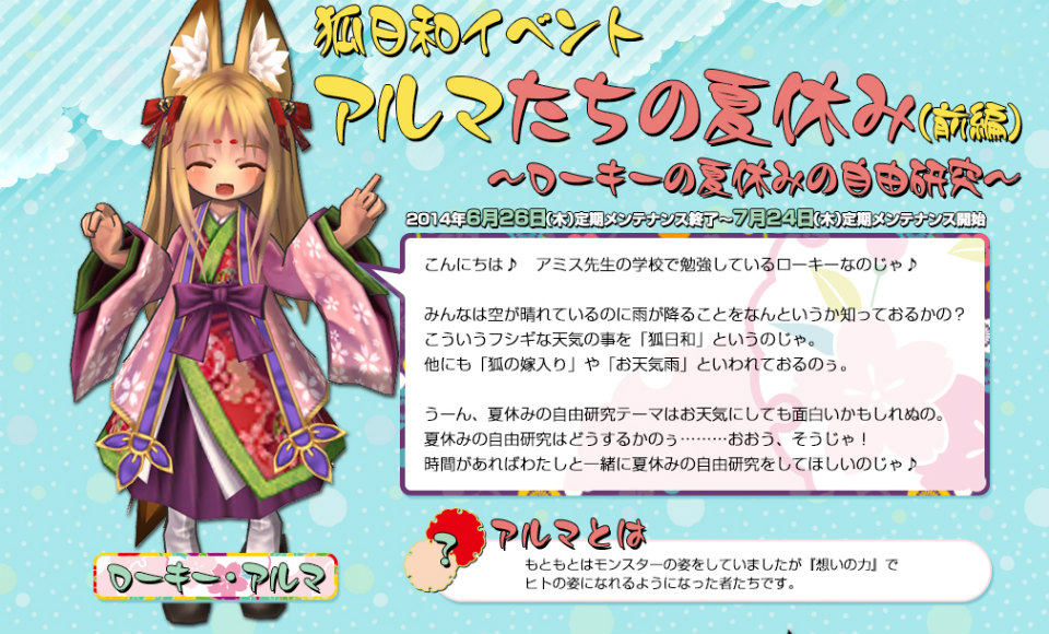 はたして夏休みの自由研究はうまくいくのか?お手伝いの結果は来月のイベントに続きます。かわいいアルマがたくさん登場する「狐日和の夏祭り」を楽しんじゃいましょう。