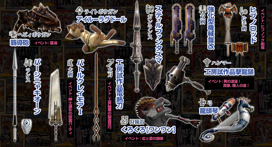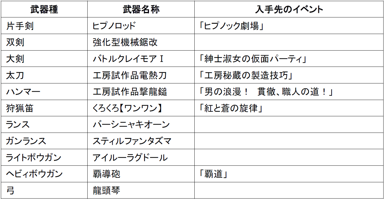 さらに、その「G級技巧武器」の生産素材が入手できるイベントを7月2日(水)より順次配信いたします。また、「G級技巧武器」の強化素材は7月9日(水)から開催される「パローネ大航祭」で入手可能!まずは以下の11本が対象。その他、歴代人気武器も続々登場予定!