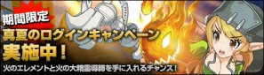 「火の大精霊導師」とレアカード「火のエレメント」が手に入る「真夏のログインキャンペーン」を下記の日程で開催いたします。期間中、1日1回ゲーム内にログインすると、ログイン日数が+1されます。合計ログイン日数に応じてプレゼントが入手できます。ログインキャンペーンの画面は、メイン画面左の「期間限定」から開くことができます。