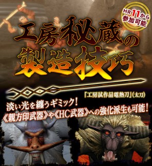 カプコンは、「モンスターハンター フロンティアG」において、本日7月2日よりG級技巧武器への強化が可能な武器を入手できるイベント「ヒプノック劇場」、ならびに「工房秘蔵の製造技巧」を開催した。