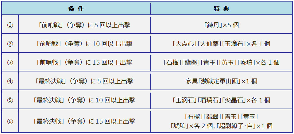 7月12日(土)と13日(日)に行われる“最終決戦”(争奪)に出撃した回数に応じて、特典をプレゼントします。