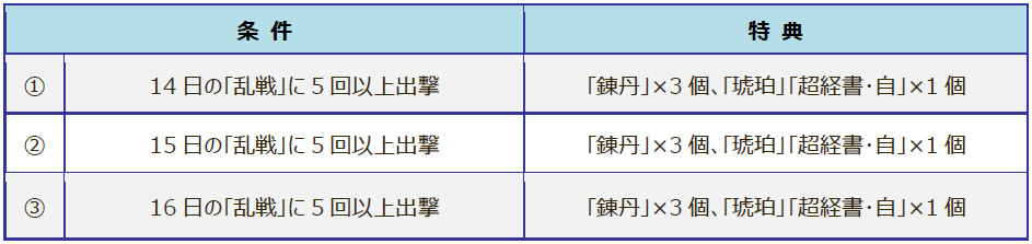 最終決戦終了後の7月14日(月)からは、「乱戦」開催時間を拡大します。また、「乱戦」に出撃した回数に応じて、特典を受け取れるDMCもあわせて実施します。