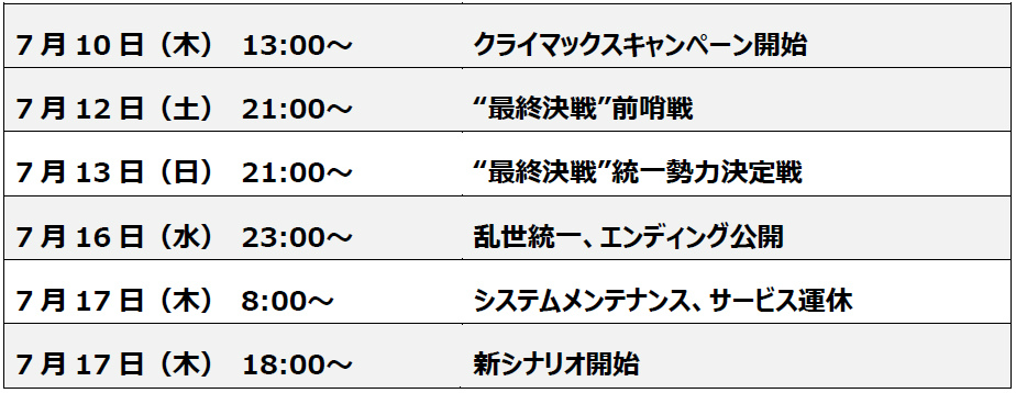 新シナリオ開幕までのスケジュールは以下のとおりです。なお、2014年7月17日(木)8:00から18:00までの間は、新シナリオの準備のため、システムメンテナンスを行わせていただきます。