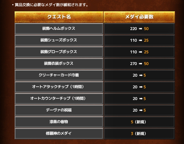 前回の大型アップデート「Epic8-3」にて実装された「メダイクエスト」は、一日一回こなすことが出来るデイリークエストで、完了すると「古き世のメダイ」を入手することが出来ます。「古き世のメダイ」は規定の数集めると、NPC「メダイ交換司」により、このメダイ賞品でしか手に入らない装飾アイテムをはじめ、冒険に大変役立つアイテムと交換することが出来ます。Epic9-1では、この「古き世のメダイ」に替わり、「修羅神のメダイ」が登場します。