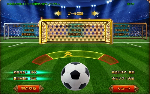 イベント期間中、フリーキックのミニゲームに挑戦することができます。シュートが成功すると報酬がもらえます。フリーキックはブロンズ(1000金貨)、シルバー(40NP)、ゴールド(100NP)の3種類の中から選択でき、それぞれ入手できるアイテムが異なります。