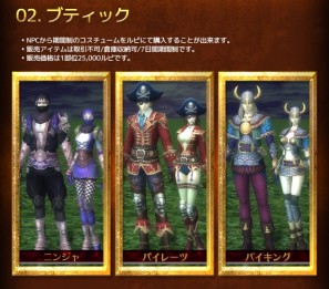 オープニングラインナップは根強い人気を誇る「ニンジャ」、「パイレーツ」、「バイキング」の三種類です。期間制アイテムですが、非常に廉価となっているので、気分によって着替えたり、永久アイテムを手に入れる前にお試しで着てみたりと、これまで以上に装飾アイテムを手軽に楽しめます。