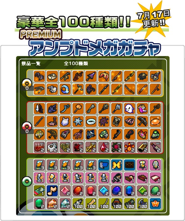 2014年7月17日(木)のメンテナンス終了後からプライムマーケットのアンプドガチャに、新カラーアクセサリを多数実装いたします。更に7月17日(木)のメンテナンス終了後から9月4日(木)のメンテナンス開始前までの間、「素材」アイテムと「ぶき」アイテムの獲得個数を増加させていただきます。