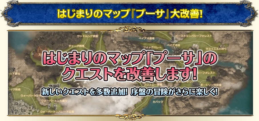 冒険のはじまりとなるマップ「プーサ」を改善します。新しいクエストを多数追加し、序盤の冒険から簡単に分かりやすくお楽しみいただけるようになります。