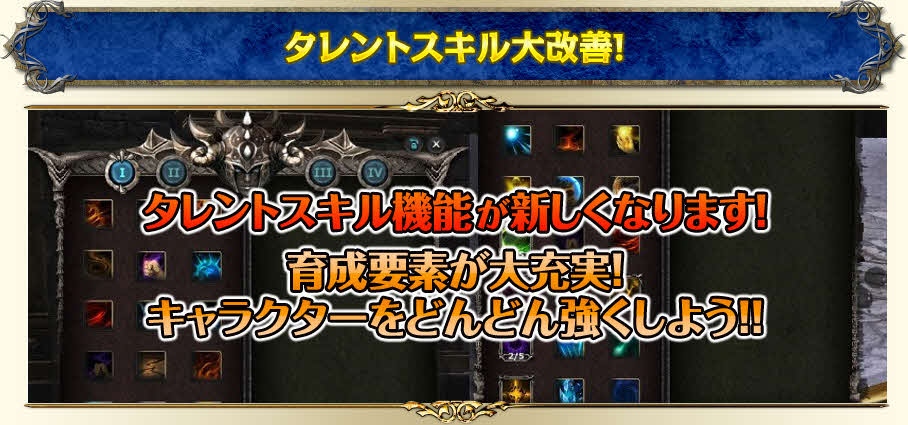 タレントスキル機能が新しくなります。キャラクターを育成する要素が大きく充実し、自分のキャラクターをより強く戦略的に育成することが可能となります。
