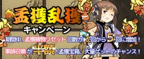 キャンペーン期間中、孟獲捕物におけるリセット可能回数が 5回に変更されます。また、「軍師召喚」を行う際の必要宝珠数が、通常の半額に変更されます。