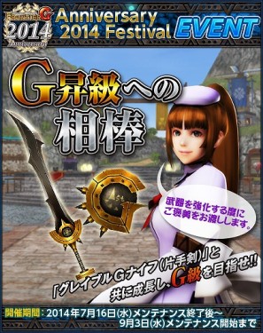 ガイド娘に話しかけるだけで、G級まで強化可能なイベントオリジナル武器「グレイブルGナイフ」(片手剣)の生産素材が受け取れます! さらに期間中「グレイブルGナイフ」を一段階強化する度にガイド娘に話しかければ強化報酬も受け取れる!