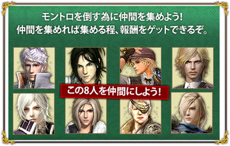 期間中指定のミッションをクリアして仲間を増やして、サイコロをGETしてください。サイコロが出た目でシンボルを進め、留まった場所でもらえるアイテムや、特別報酬がもらえます。まずはこの8人を仲間にしておこう。そして指定されたミッションをクリアしよう。