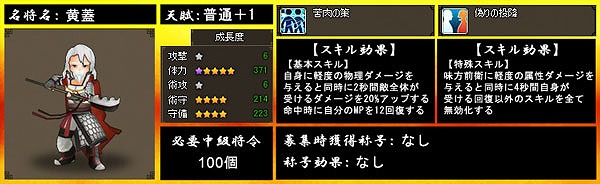 新しく登場した中級名将「黄蓋」は、体力のステータスが高く、防御性能に特化した名将です。黄蓋自身は敵を攻撃することができませんが、基本スキル「苦肉の策」の効果により敵が受けるダメージを引き上げ、戦闘をサポートしてくれます。