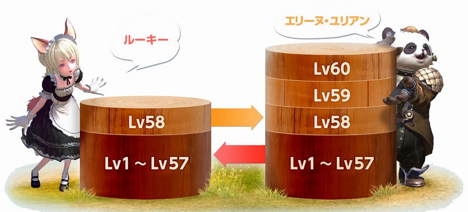 1IDに1回限り、レベル57以下のキャラクター限定で「エリーヌ」サーバー、「ユリアン」サーバーからルーキーサーバへ無料で移動可能となります。こちらのルーキーサーバーは、常時獲得できる経験値が2倍となる期間限定のサーバーです。なお、ルーキーサーバーの上限レベルは58となります。