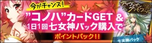 2014年9月3日(水)17:00 ~ 2014年9月10日(水)11:30までの期間、累計チャージDGが4,800 DGに達するごとに、プレミアム特典として「優しき神獣コノハ(★4)」を1枚プレゼント!