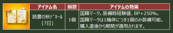 「読書の秋」をモチーフにデザインされたデカールは経験値/BPが+250%の効果があります。一気に上のレベルを目指したい場合にはぜひご利用ください!