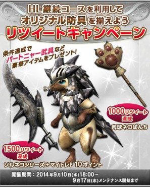 本日開催の「HL(ハンターライフ)継続コースを利用してオリジナル防具を揃えよう」に関するMHF-G公式ツイートをリツイートすることで、パートニャー武具&マイトレポイントがもらえるリツイートキャンペーンを開催いたします。この機会にリツイートしてぜひ、パートニャーに装備させましょう!