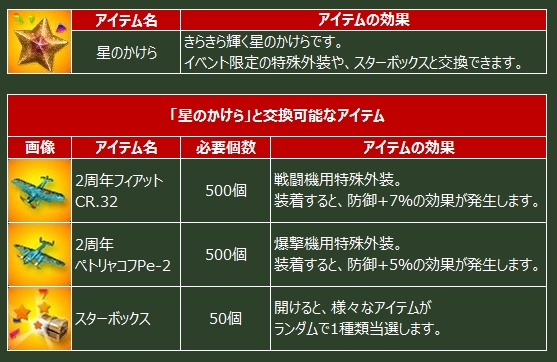 イベント期間中、ミッション開始時に星が出現します!出現した星を撃墜すると、一定確率で「星のかけら」をゲット!星のかけらを集めると、生命の木でイベント限定の特殊外装や「スターボックス」と交換できます!ぜひこの機会に挑戦して、2周年記念の特殊外装をゲットしてください!